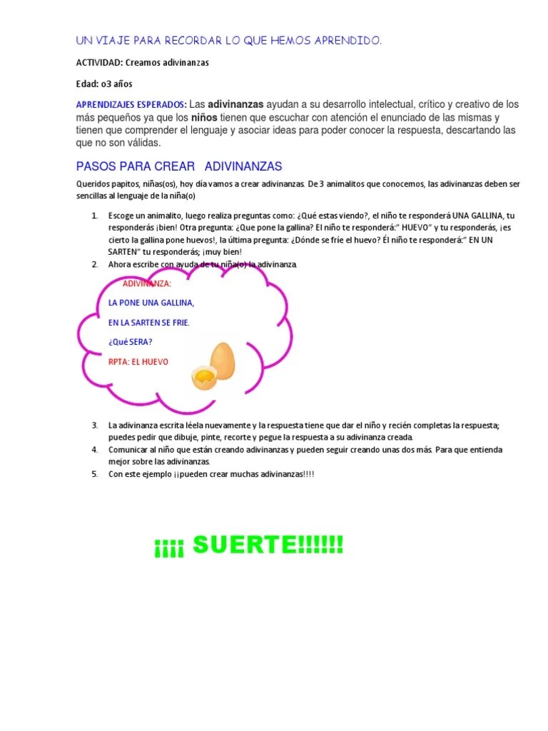 Silvina gallina silvina mi gallina usa zapatitos de bailarina se peina y se alista igual que un artista y con su capote se hace un rodete. Con cresta, plumas y pico,. Te comes una tortilla, pero . Blanco es, la gallina lo pone, es la sartén se fríe, y por la boca se come. Para poder dar con la respuesta correcta, los niños deben aprenderse la adivinanza, también llamada acertijo.